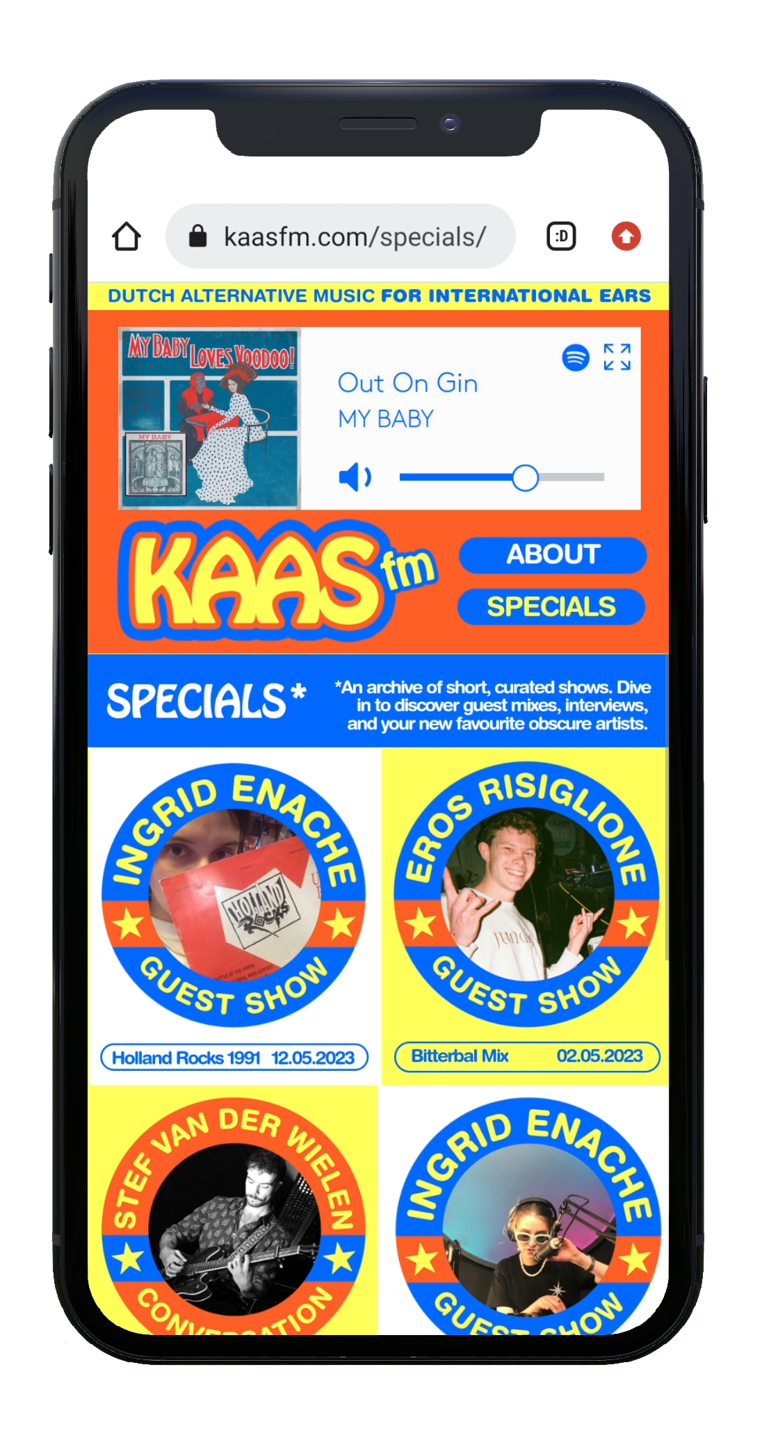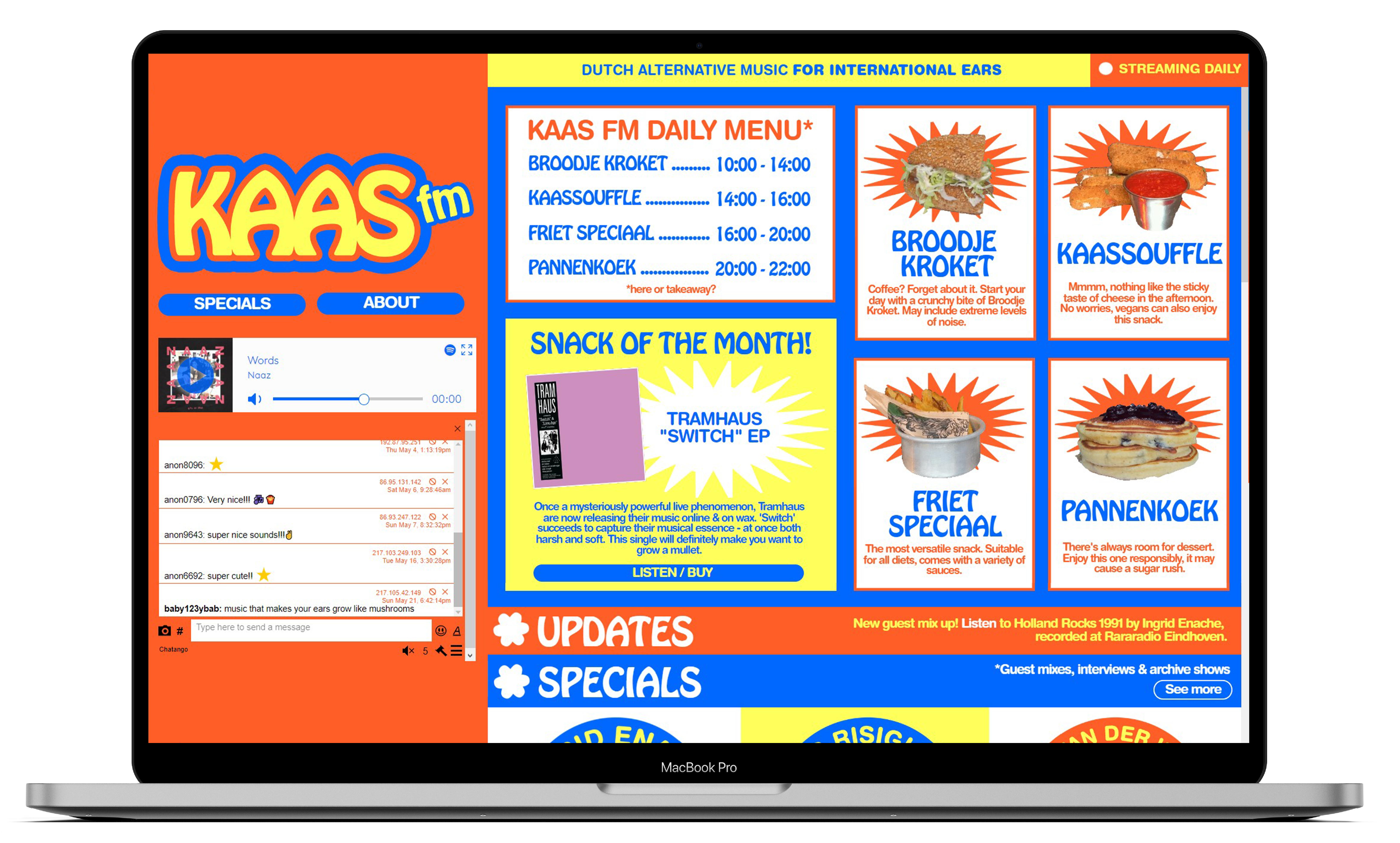 Kaas FM is an online radio station broadcasting entirely Dutch alternative music. Moving from Romania, Ingrid Enache found a sense of belonging in the Netherlands by getting immersed in the local music scene. Kaas FM is a music discovery platform which mirrors this experience in order to create a bond between Dutch music and its prospective international audience. Its visual identity pays homage to traditional Dutch Cafetaria’s, now mostly run by expats. Kaas FM celebrates this immigrant reality of starting your life again in a new country and building new communities, whether it is through music, food or both.